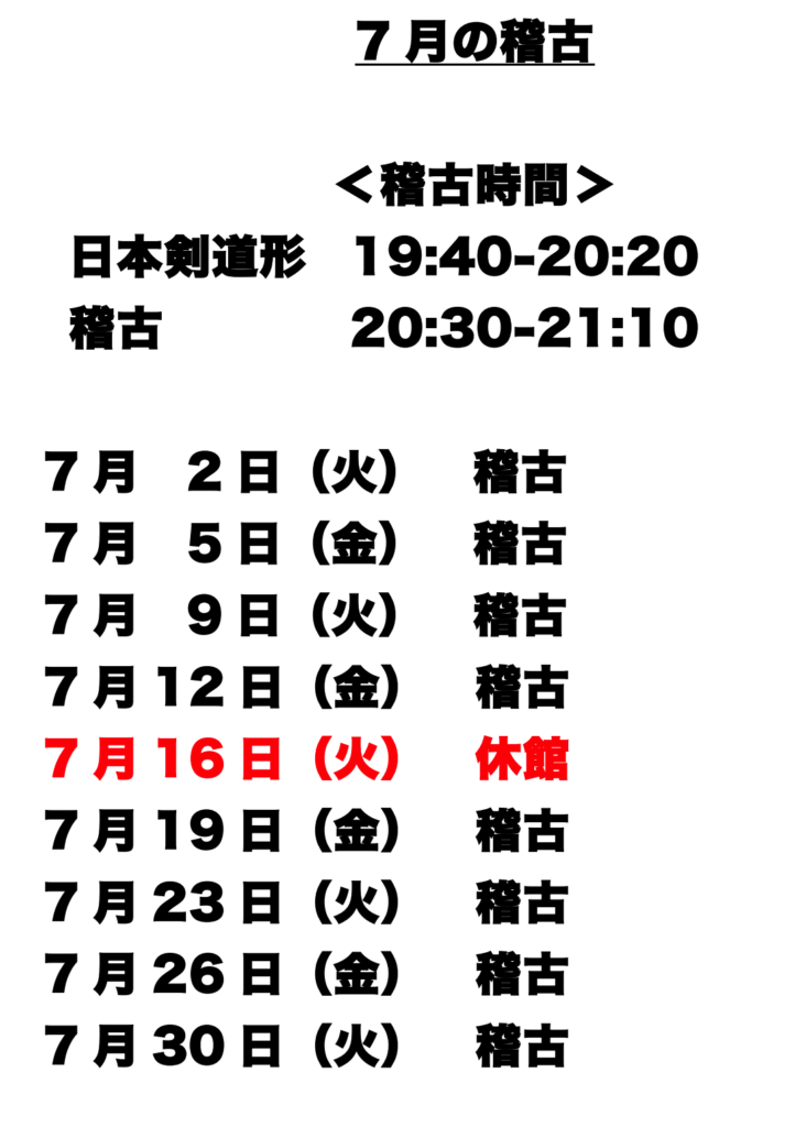 2024年7月の稽古 2024 6/24 稽古予定 2024年6月24日2026年1月24日 日頃より道場運営のご協力ありがとうございます。 暑い日が続きますので、水分補給の準備など各自でお願いします。 稽古予定 Screenshot 稽古予定 【訃報】内堀詩子先生のご尊父様ご逝去 井上夏希先生 長野県居合道大会 個人戦優勝