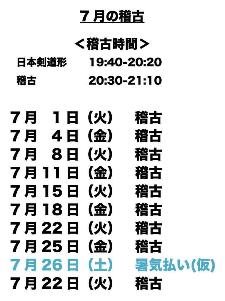 2025年7月の稽古 2025 6/24 稽古予定 2025年6月24日2026年1月24日 下記を予定しています。水分補給の準備などお願いします。 稽古予定 稽古予定 2025年6月の稽古 2025年8月の稽古